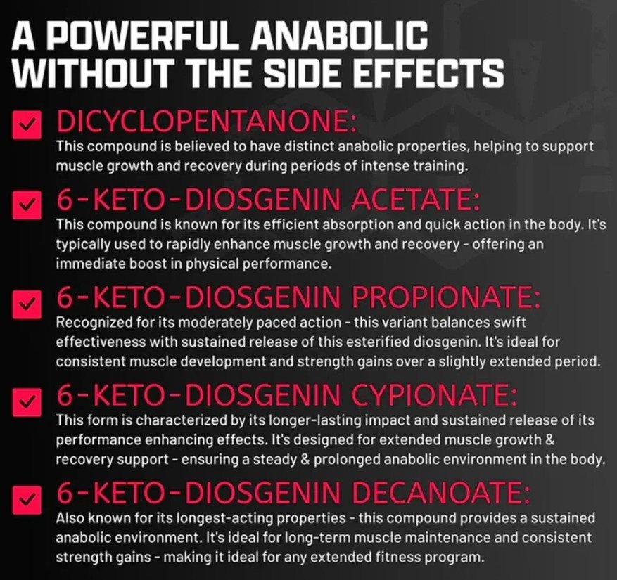 6-Keto-Diosgenin Acetate – Derived from natural plant compounds, this ingredient is designed to support anabolic activity without hormonal disruption.